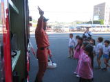 延岡市内の保育園のお友達と一緒に消防署見学をしました。普段見る事の出来ない消防車や