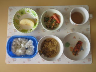 12月11日 魚の人参みそ焼き ナムル かきたま汁 トマト リンゴ